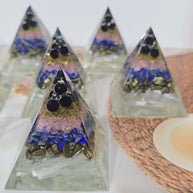 A premium decorative pyramid featuring layered natural materials like Selenite, Pyrite, Lapis, Rose Quartz, and Obsidian. Designed with a clear finish, it enhances home or office décor and makes a unique gift piece.